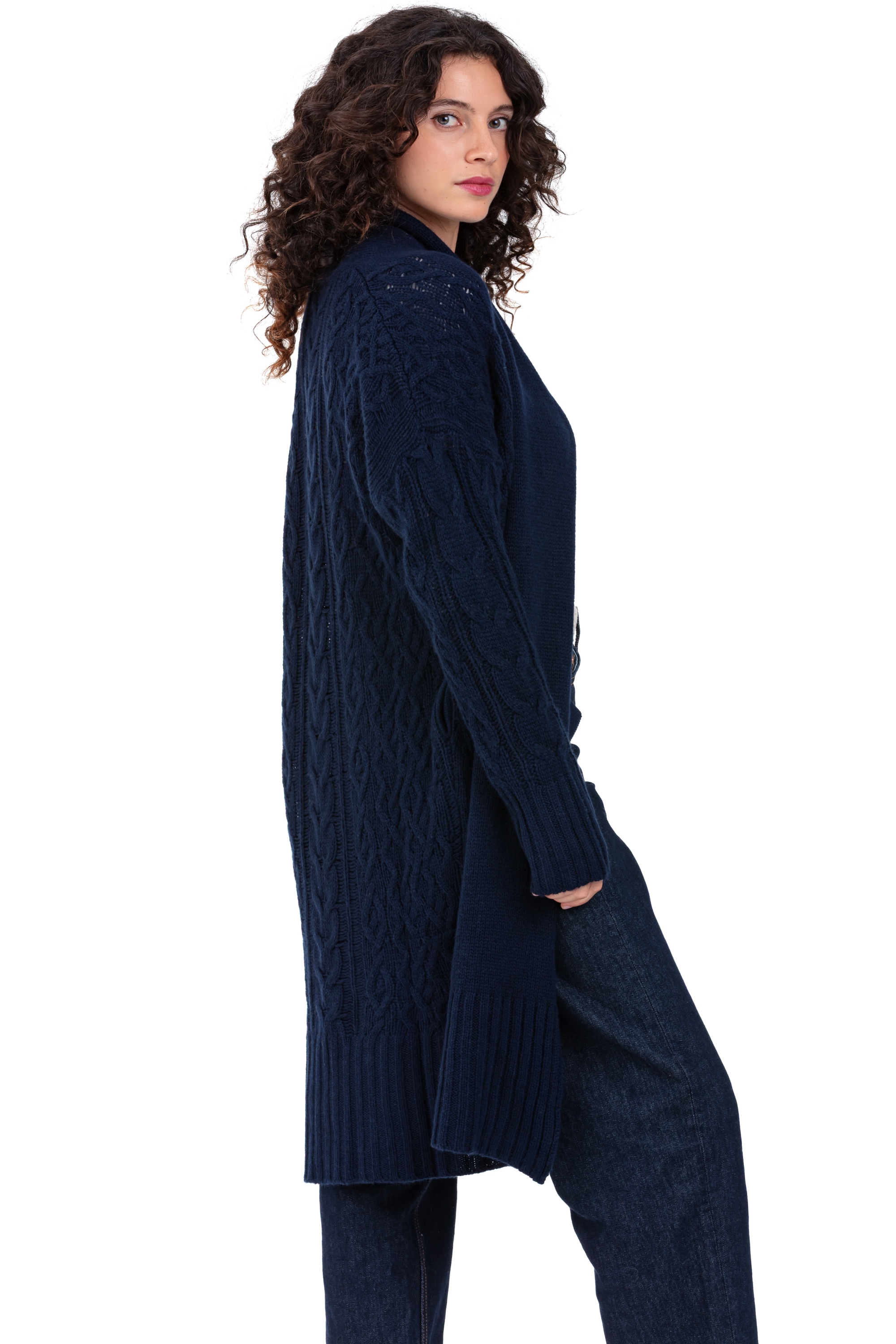 Spectacular and cocooning, the PHILOSOPHY women’s cardigan is a truly exceptional piece. Knitted in 100% 8-ply loose-gauge cashmere, it delights with its shawl collar, maxi length, and cables. Without fastening, it slips on easily like a lightweight, refined coat.