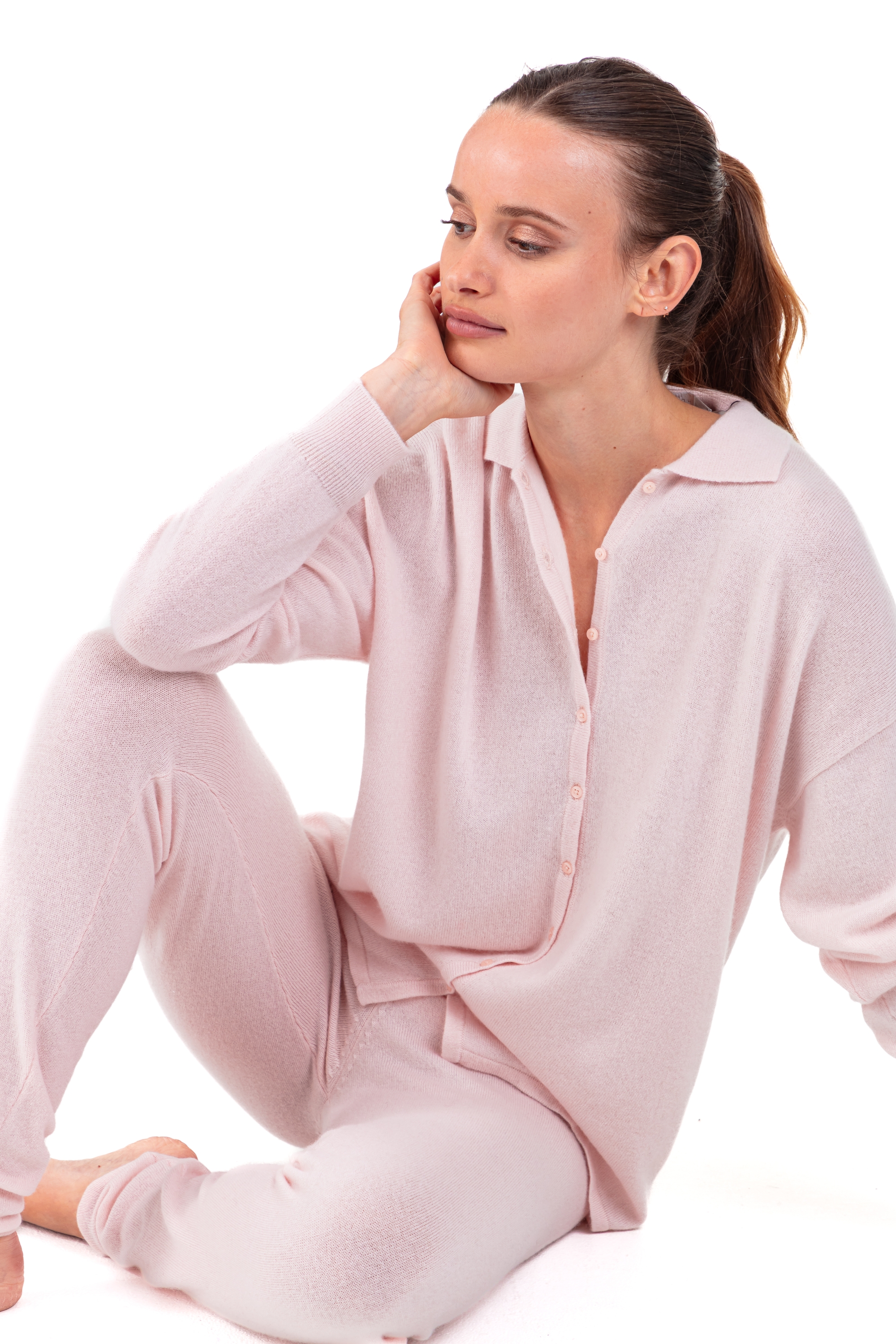 Chic and comfortable, the PIRAMISU pyjama set combines softness with refinement. Knitted in 100% 2-ply cashmere, it consists of slim-fit leggings, inspired by the Xelina model, and a loose-cut buttoned shirt top.