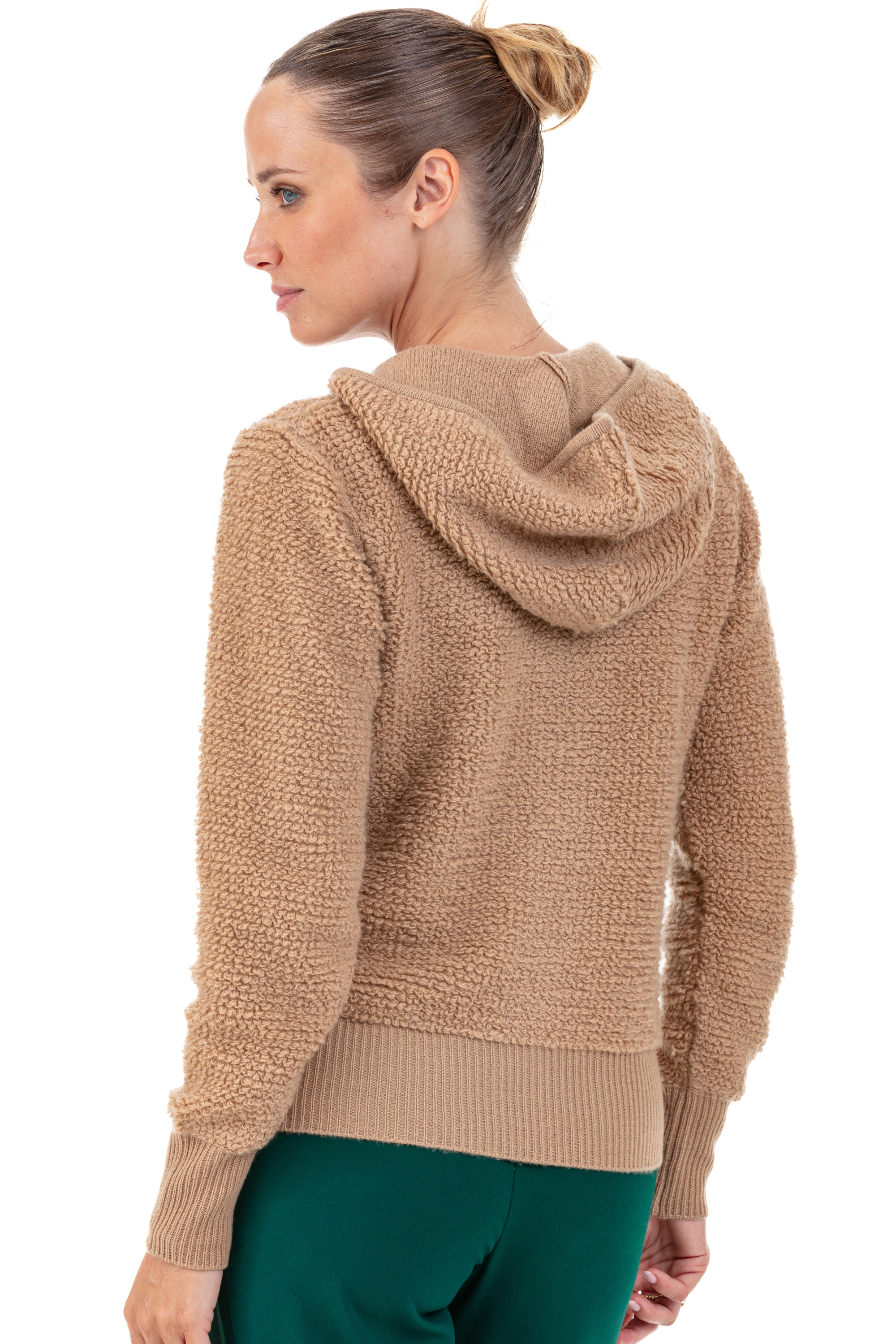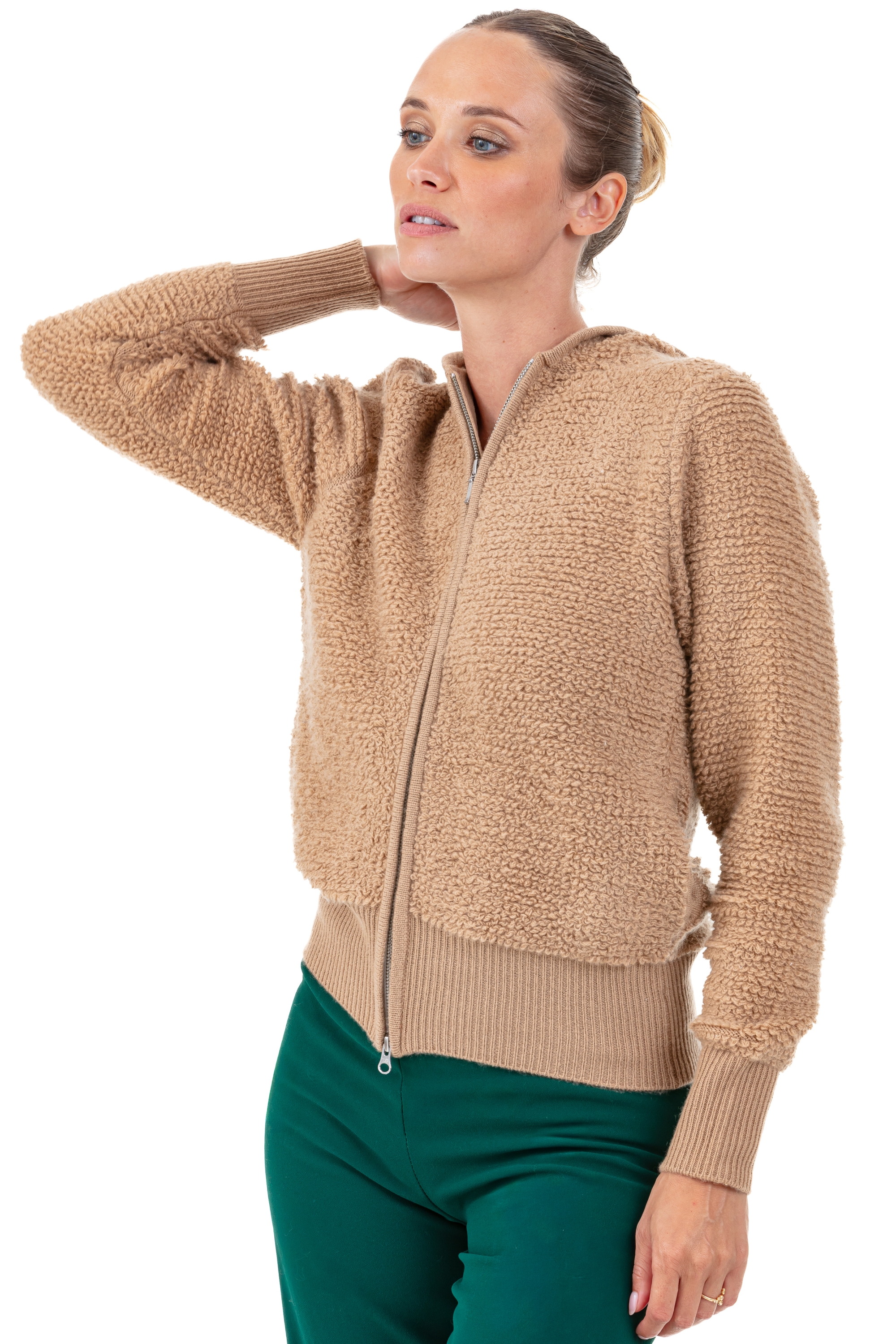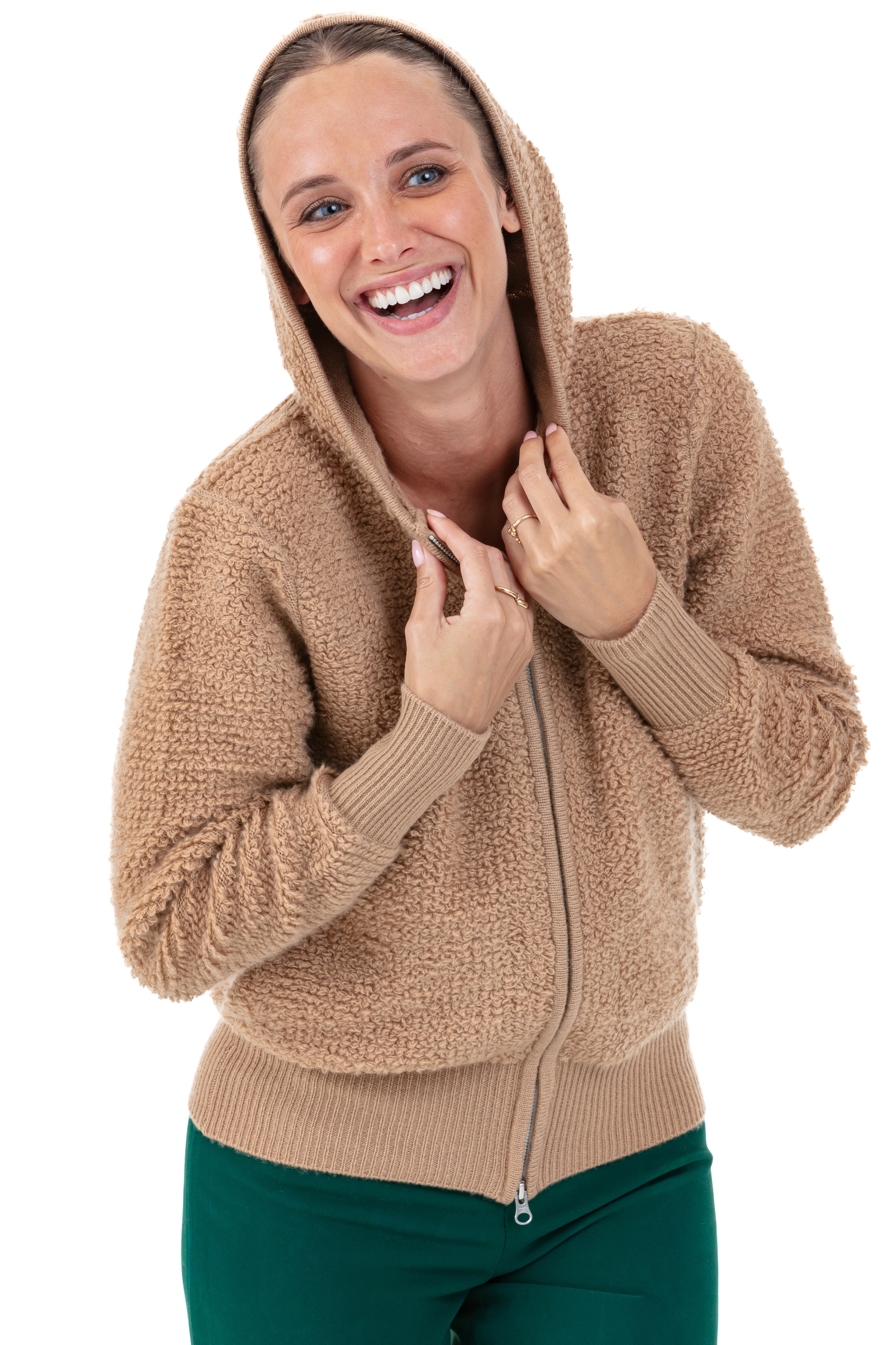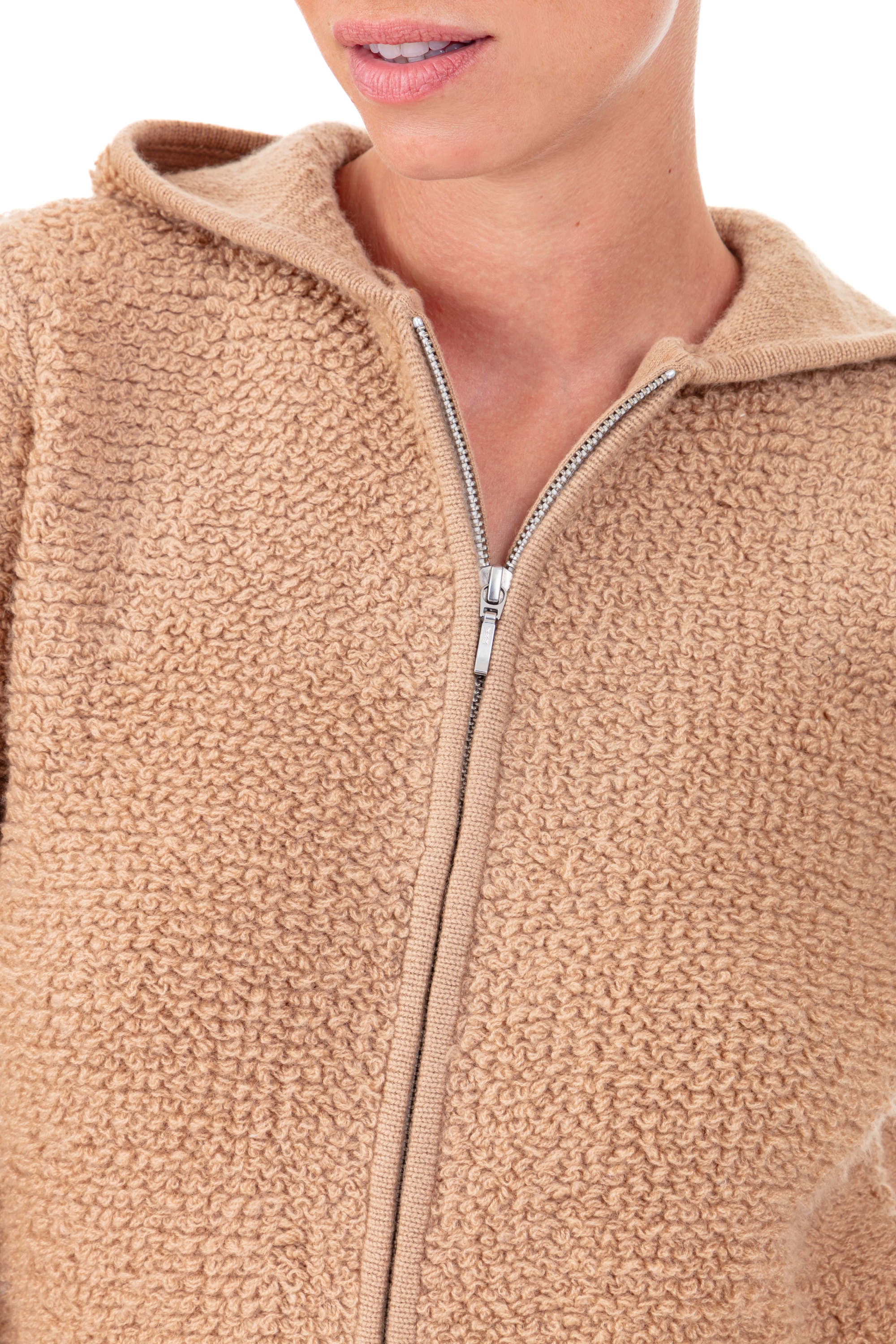 Comfortable and modern, the PAVLOVA women’s cardigan is distinguished by its boucle knit texture and relaxed style. Made in 100% 4-ply cashmere, it features a double-slider zip fastening and a hood, for a sporty chic appeal.