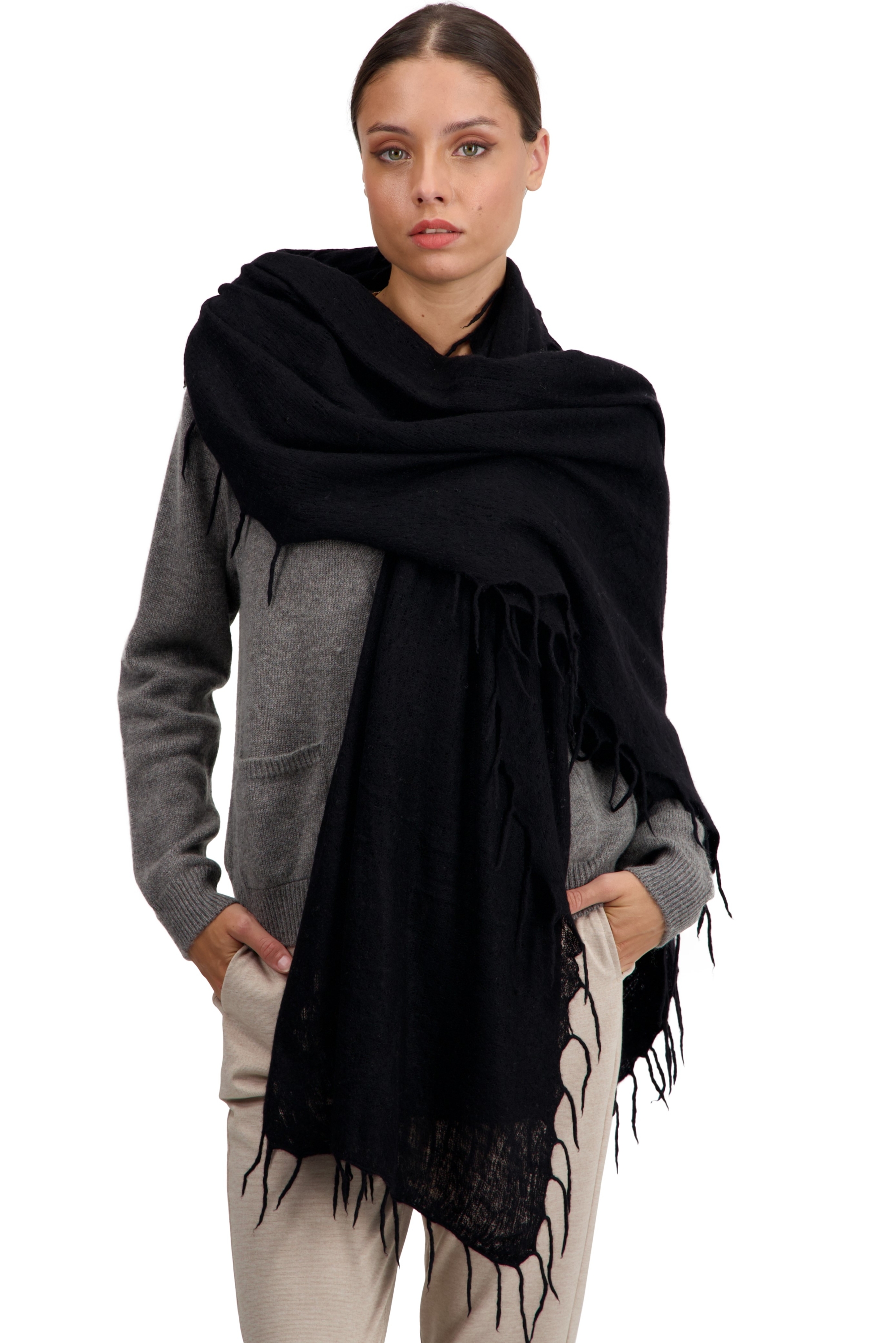 A very large scarf with an airy knit and incredible softness.