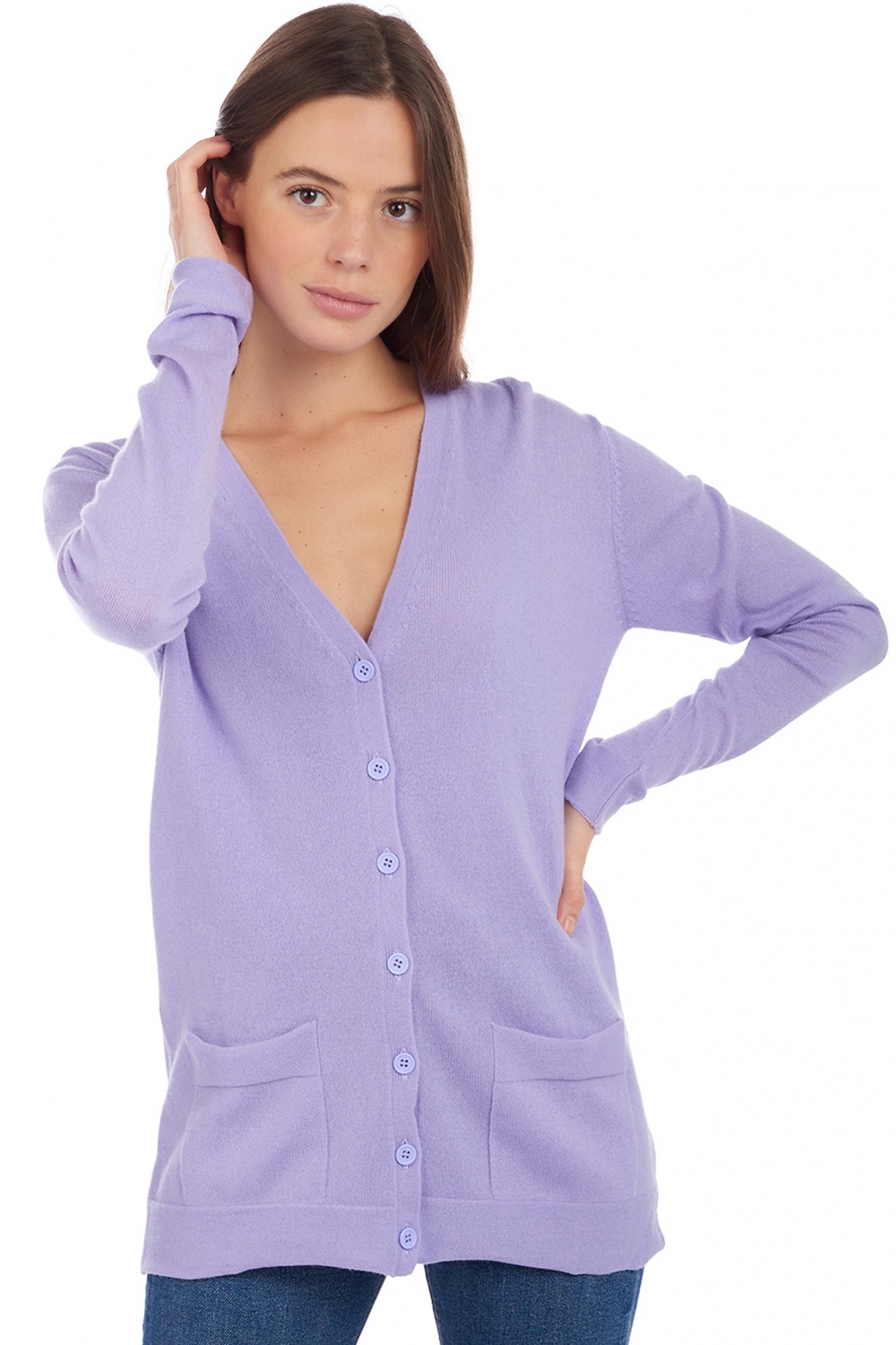 Attractive slightly long cardigan with 2 tone buttons and 2 patch pockets.