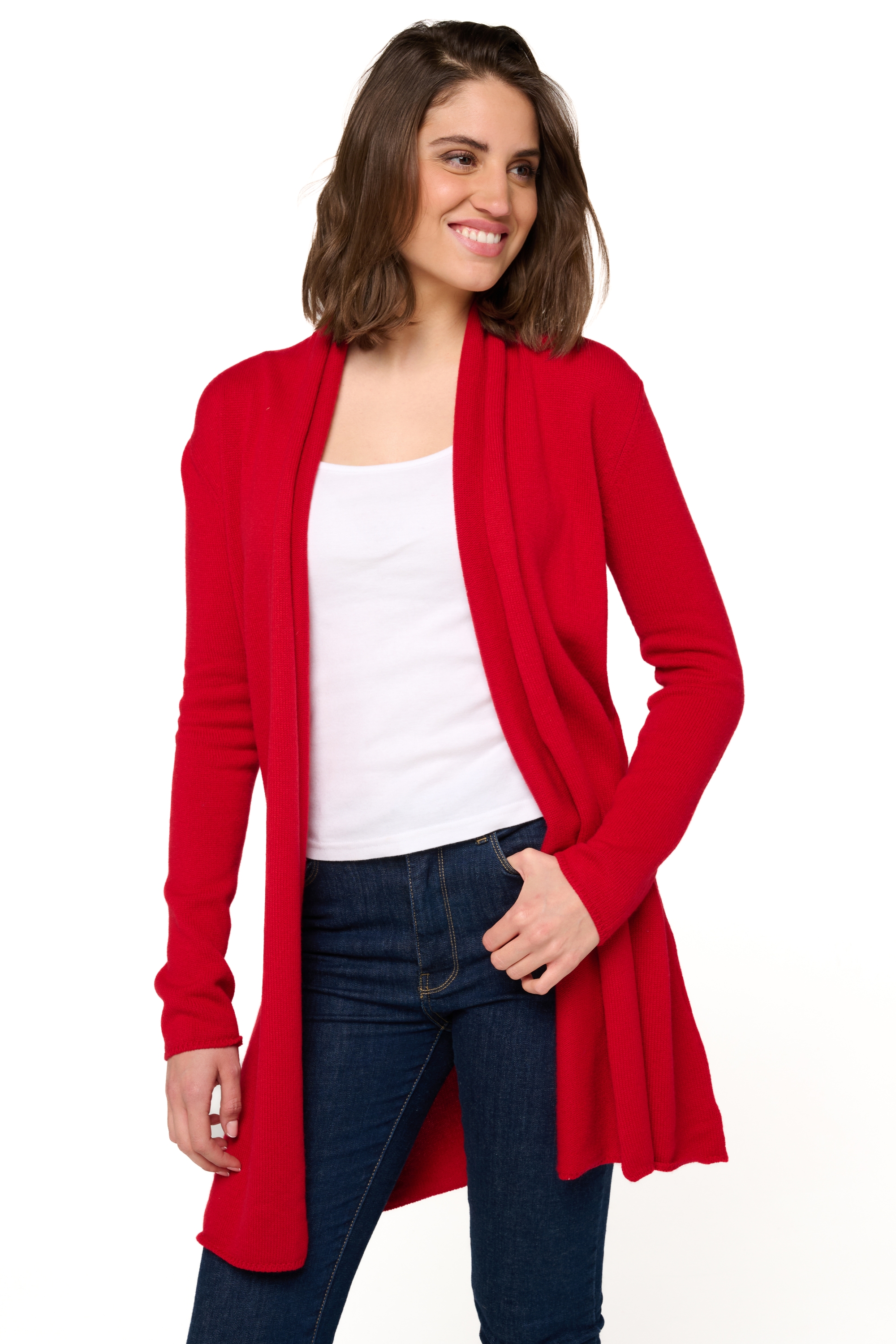 This long Cardigan is fluid and feminine. Created with a cocooning spirit with no rib on the cuff and hem.