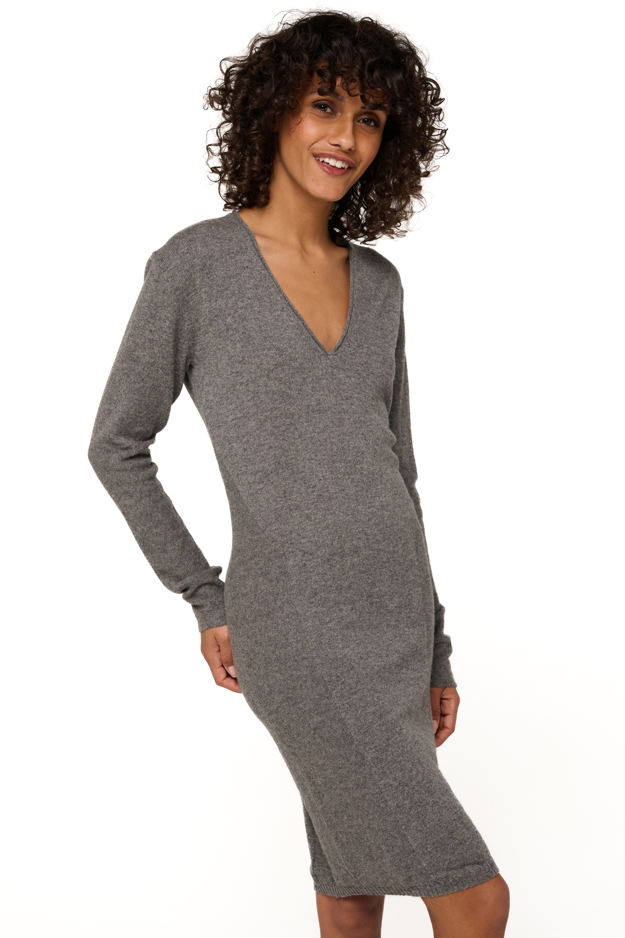 Elegant dress with a deep and narrow V neck.