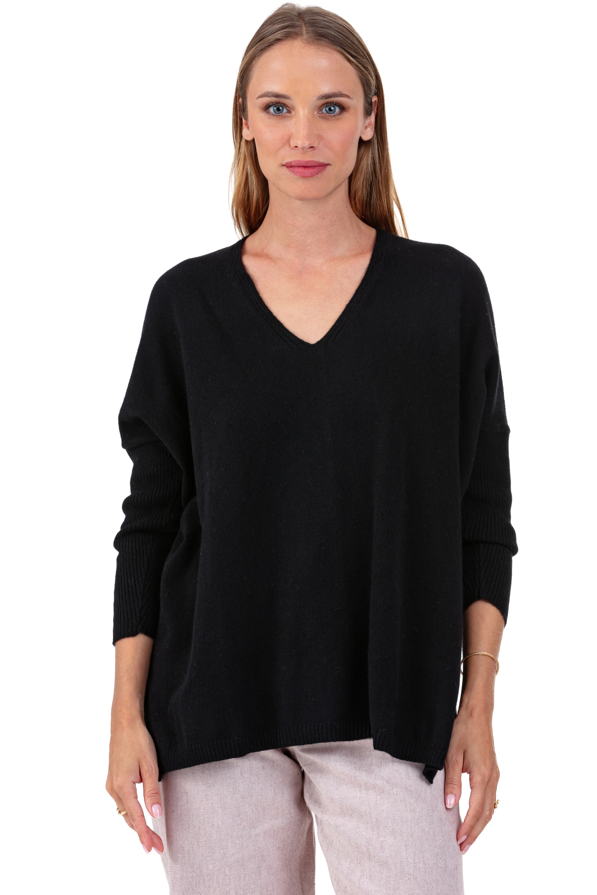 • This oversized V-neck cashmere jumper is ideally paired with slim trousers or a pencil skirt to balance the silhouette. A modern and feminine piece, perfect for all your elegant yet relaxed outfits.