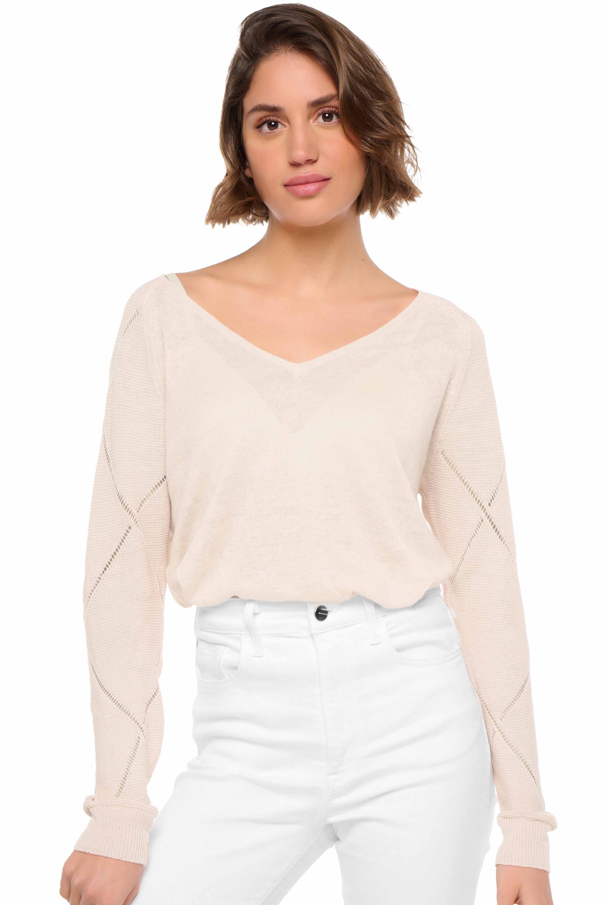 V-neck long-sleeve linen sweater. We adore it for its lovely openwork knitting on the sleeves, making it a refined piece. Completely knitted, our linen collection blends elegance and casualness to offer delicate pieces to be worn daily.