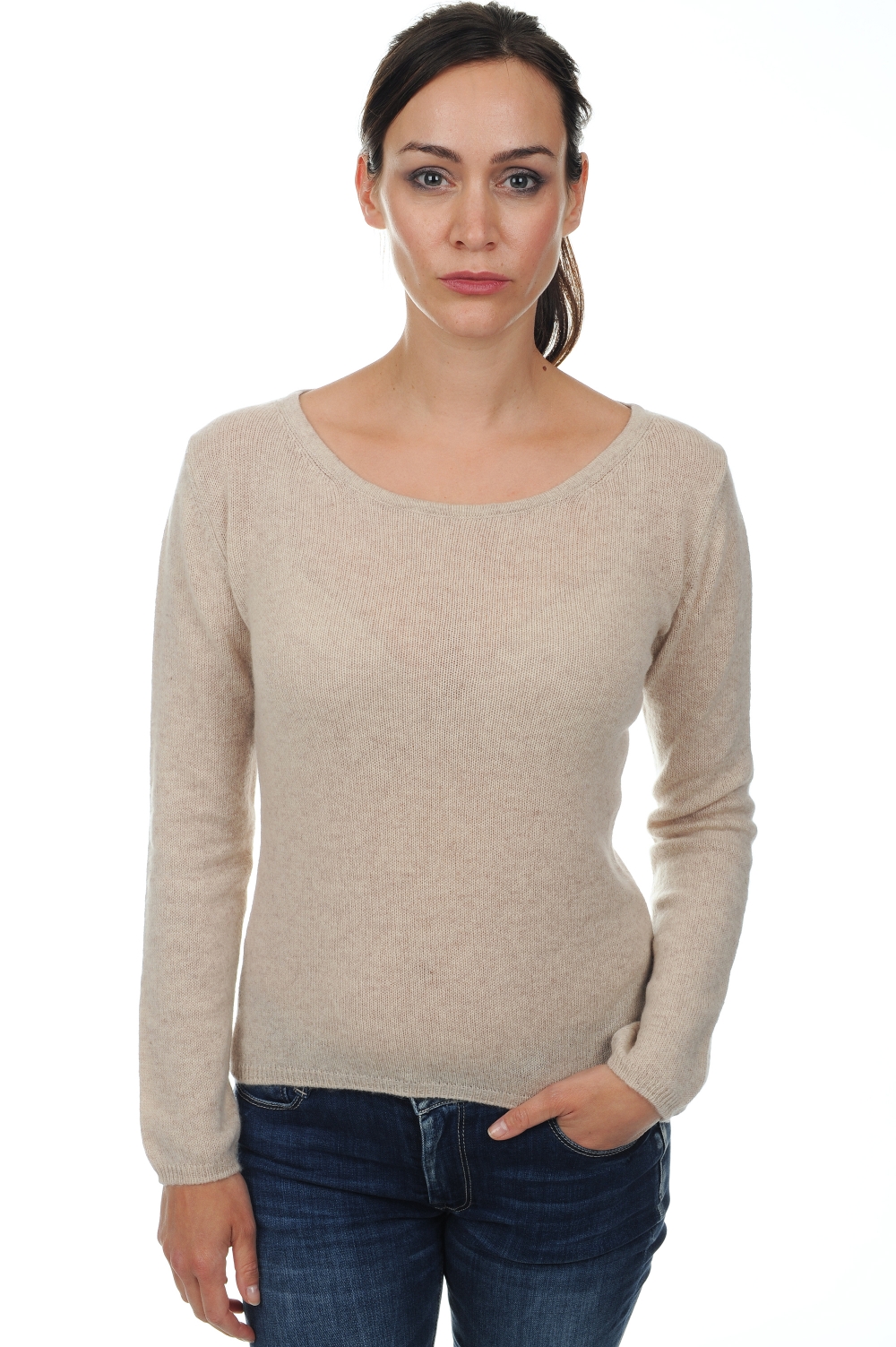 Roundneck ladies sweater. The stitch is ungauged which makes the sweater lighter. 2.5cm deep cuff, rib and hem welt.