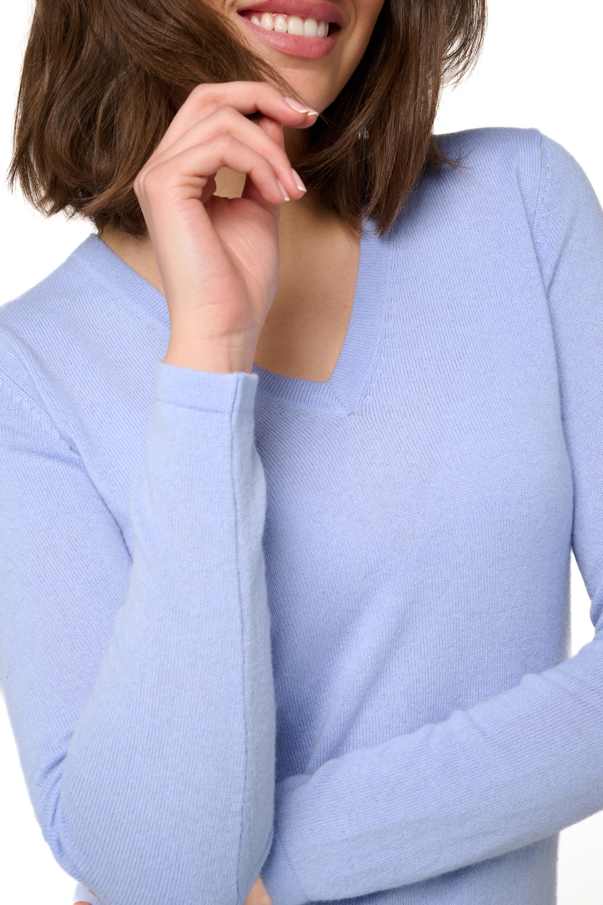 V neck collar sweater. Fine knitted edging.